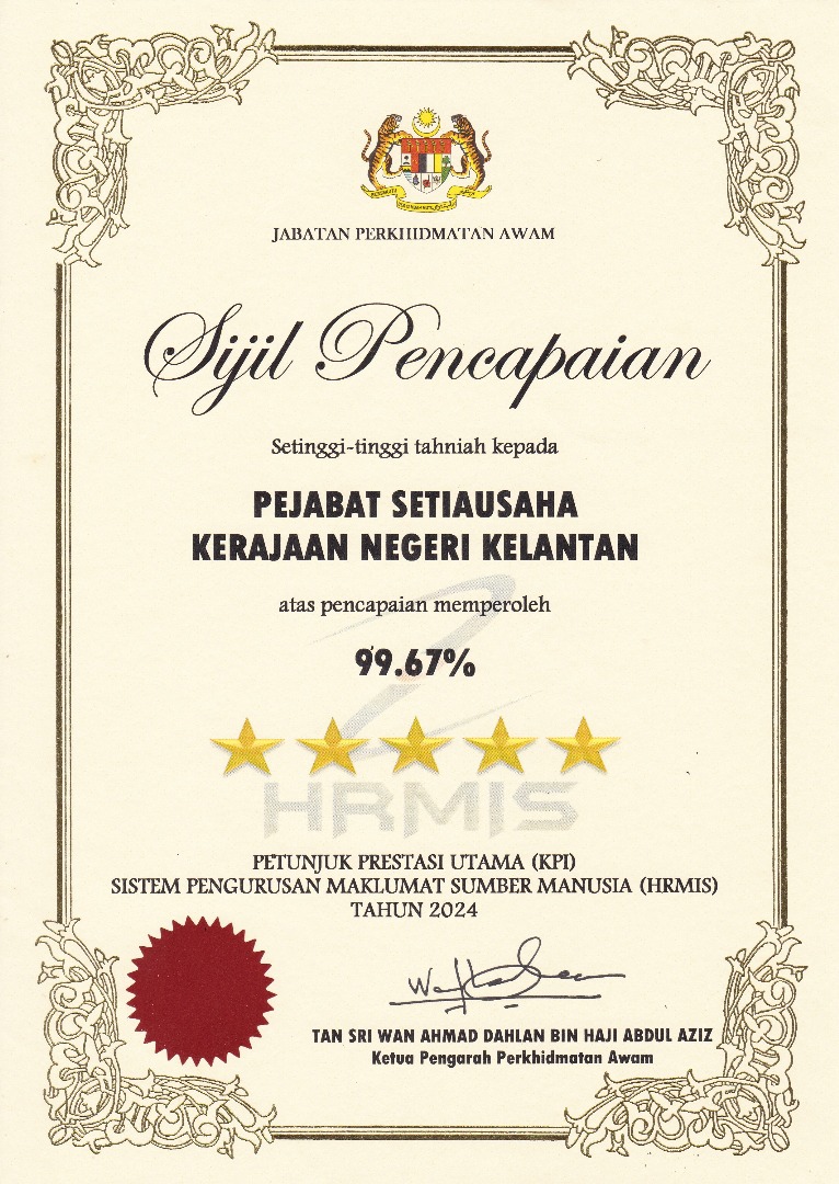 Pejabat Setiausaha Kerajaan Negeri Kelantan telah diberi pengiktirafan 5 bintang bagi Petunjuk Prestasi Utama (KPI) HRMIS Tahun 2024 oleh Jabatan Perkhidmatan Awam dengan keputusan 99.67% dan mengekalkan pencapaian 5 bintang sejak tahun 2015. Keputusan pencapaian KPI HRMIS tahun 2024 telah diumumkan pada 31 Julai 2025.